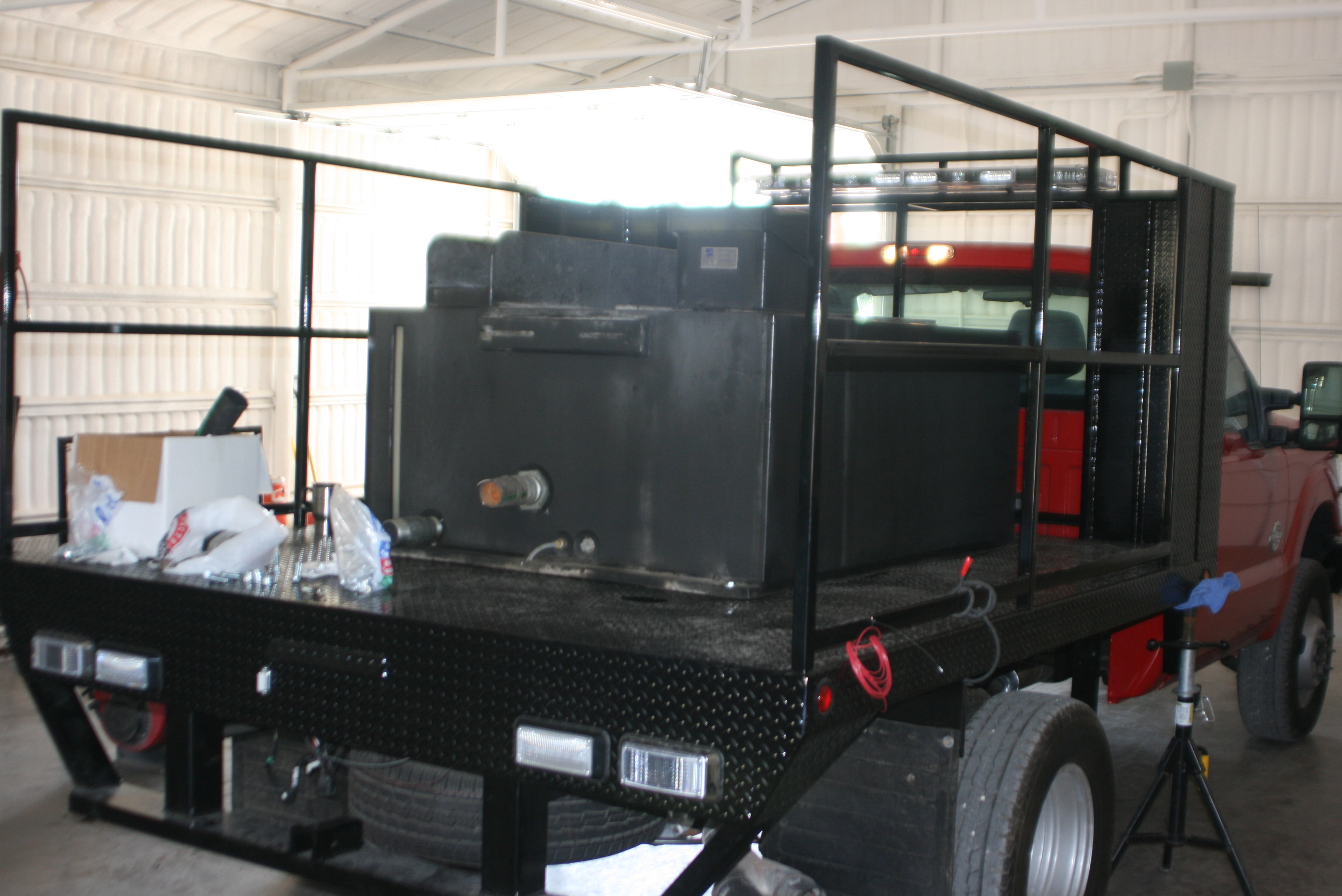 Bed and tank are mounted.